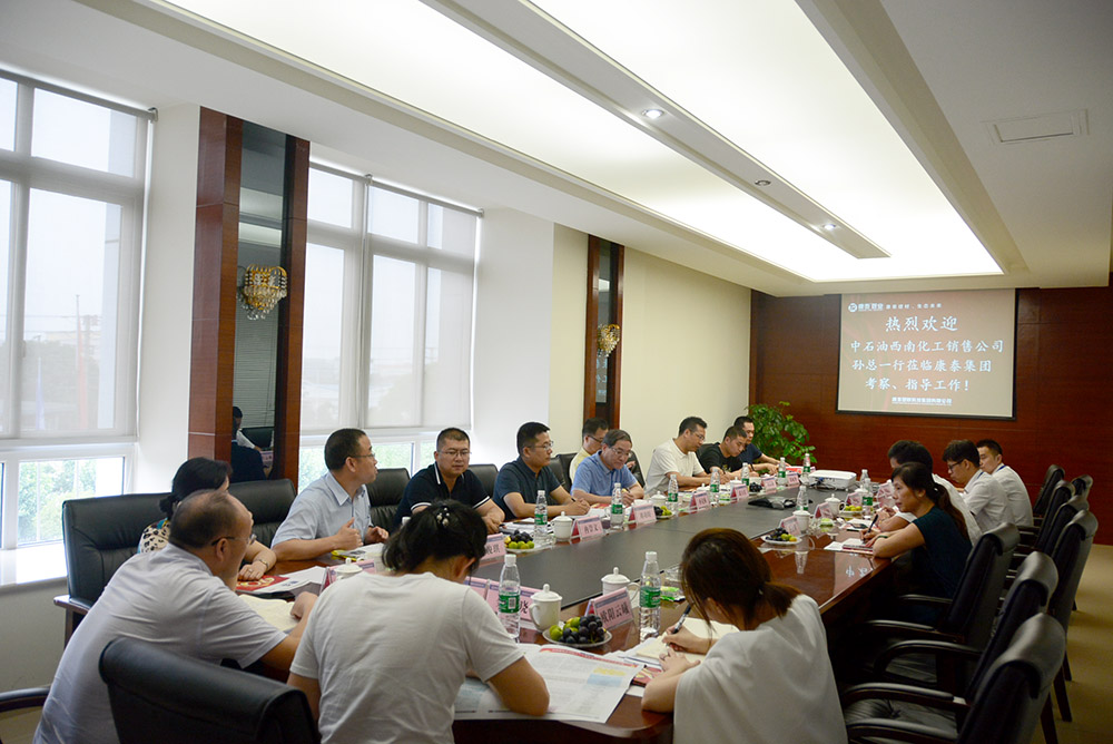 6月25日下午,中石油西南化工銷售公司總經(jīng)理孫克棟率領(lǐng)四川石化、獨山子石化相關(guān)負責人一行蒞臨康泰參觀考察??堤┘瘓F董事長兼總裁林云青,副總裁張文霖,采供中心總監(jiān)潘云琴熱情歡迎領(lǐng)導的到來并座談。