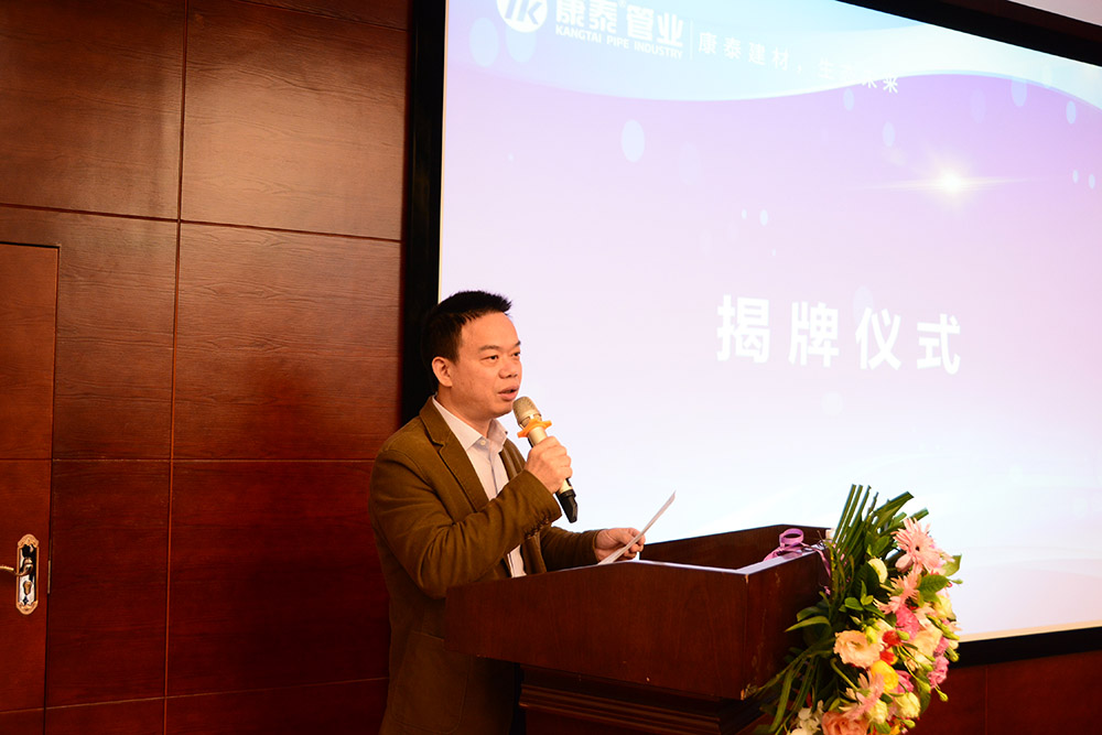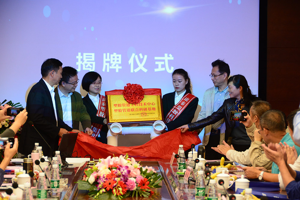 領導致辭結束后,四川省土木建筑學會給水排水專業(yè)委員會主任委員王家良宣讀了《四川省土木工程學會給水排水專業(yè)委員會關于“塑膠管道工程技術中心”暨“塑膠管道聯(lián)合科研基地”的批復》的文件。隨后,在熱烈的掌聲中,四川省建設廳副廳級巡視員馮江,崇州市科學技術協(xié)會主席楊建,四川省土木建筑學會給水排水專業(yè)委員會主任委員王家良,康泰塑膠科技集團董事長兼總裁林云青共同為“塑膠管道工程技術中心”暨“塑膠管道聯(lián)合科研基地”揭牌。