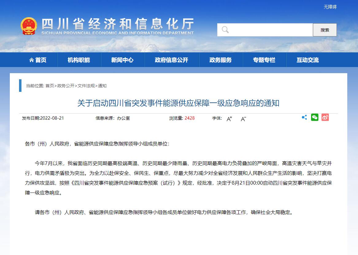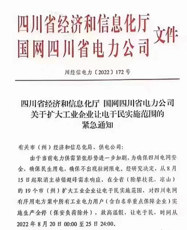 近期,因極端高溫天氣等原因,四川工業(yè)企業(yè)“臨時(shí)限電通產(chǎn)”引發(fā)行業(yè)高度重視。此前,相關(guān)部門(mén)下發(fā)通知,將限電停電期定為8月15日至20日。不過(guò)由于高溫天氣并未得到明顯好轉(zhuǎn),電力供需緊張形勢(shì)進(jìn)一步加劇,8月20日四川經(jīng)信廳、國(guó)網(wǎng)四川電力公司發(fā)布的一份《關(guān)于擴(kuò)大工業(yè)企業(yè)讓電于民實(shí)施范圍的緊急通知》,將限電期限延長(zhǎng)至25日,使得限電總時(shí)長(zhǎng)延長(zhǎng)到11天.