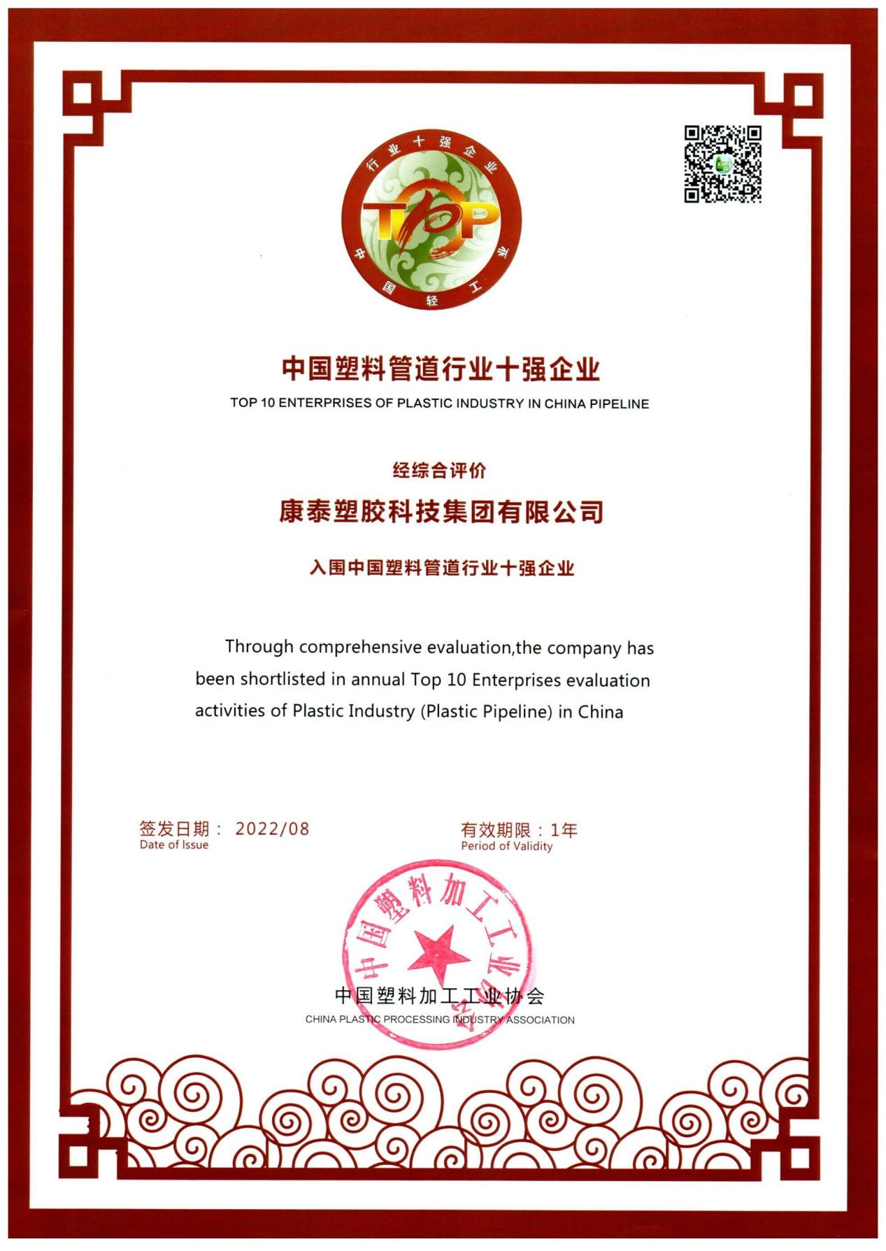 日前,2022年度中國(guó)輕工業(yè)塑料管材行業(yè)十強(qiáng)企業(yè)評(píng)價(jià)結(jié)果揭曉,康泰集團(tuán)連續(xù)七年榮獲“中國(guó)輕工業(yè)塑料行業(yè)(塑料管道)十強(qiáng)企業(yè)”稱號(hào)。
