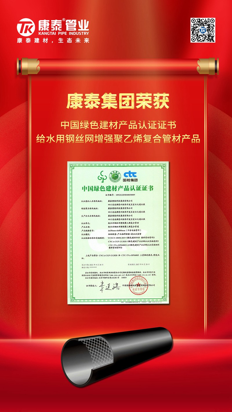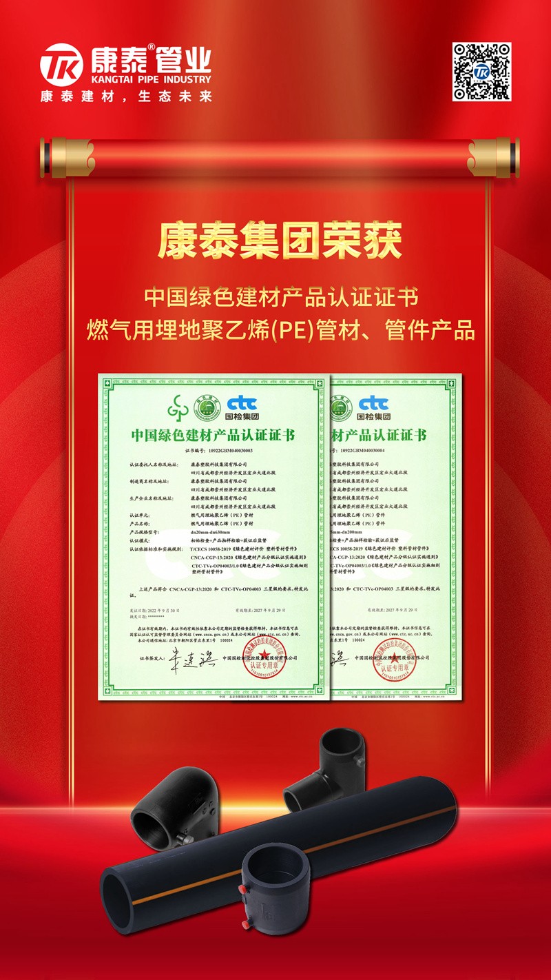 近日,康泰塑膠的給水用聚乙烯(PE)管材、管件產(chǎn)品,燃氣用埋地聚乙烯(PE)管材、管件產(chǎn)品,冷熱水用聚丙烯(PPR)管材、管件產(chǎn)品,埋地用聚乙烯(PE)雙壁波紋管材產(chǎn)品,冷熱水用耐熱聚乙烯(PE-RT)管材產(chǎn)品,給水用鋼絲網(wǎng)增強聚乙烯復(fù)合管材產(chǎn)品順利中國國檢測試控股集團股份有限公司認證審核,獲得中國綠色產(chǎn)品認證證書。充分展現(xiàn)了康泰塑膠獲證產(chǎn)品在多種綠色屬性和考核指標的硬核實力。