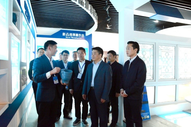 圖為康泰集團質(zhì)量總監(jiān)徐水平在向蔡曉軍主席、趙浩宇書記介紹公司產(chǎn)品