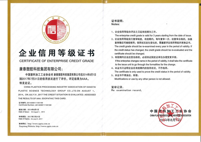 本報(bào)訊 在中國塑料加工工業(yè)協(xié)會2014-2017年度企業(yè)信用等級評級活動中,經(jīng)中國塑料加工工業(yè)協(xié)會審核批準(zhǔn),康泰集團(tuán)在信用狀況進(jìn)行了評價(jià),獲得了AAA級榮譽(yù)證書。公司榮獲此項(xiàng)殊榮,是公司始終堅(jiān)持“立足誠信,科學(xué)管理”的經(jīng)營理念所取得的成果。