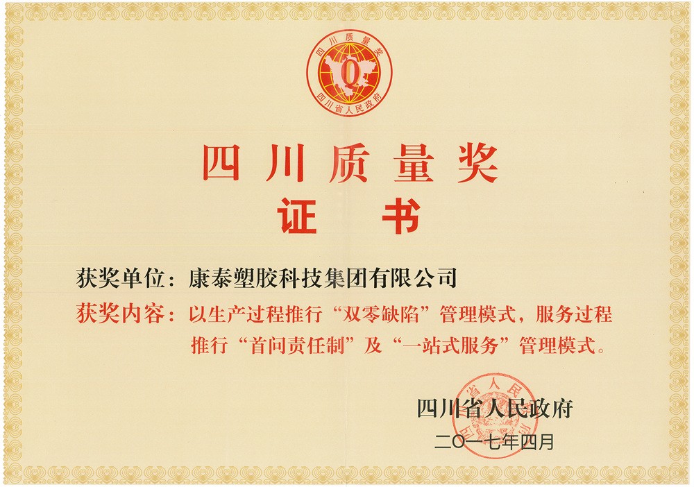 圖為第四屆四川質(zhì)量獎(jiǎng)證書