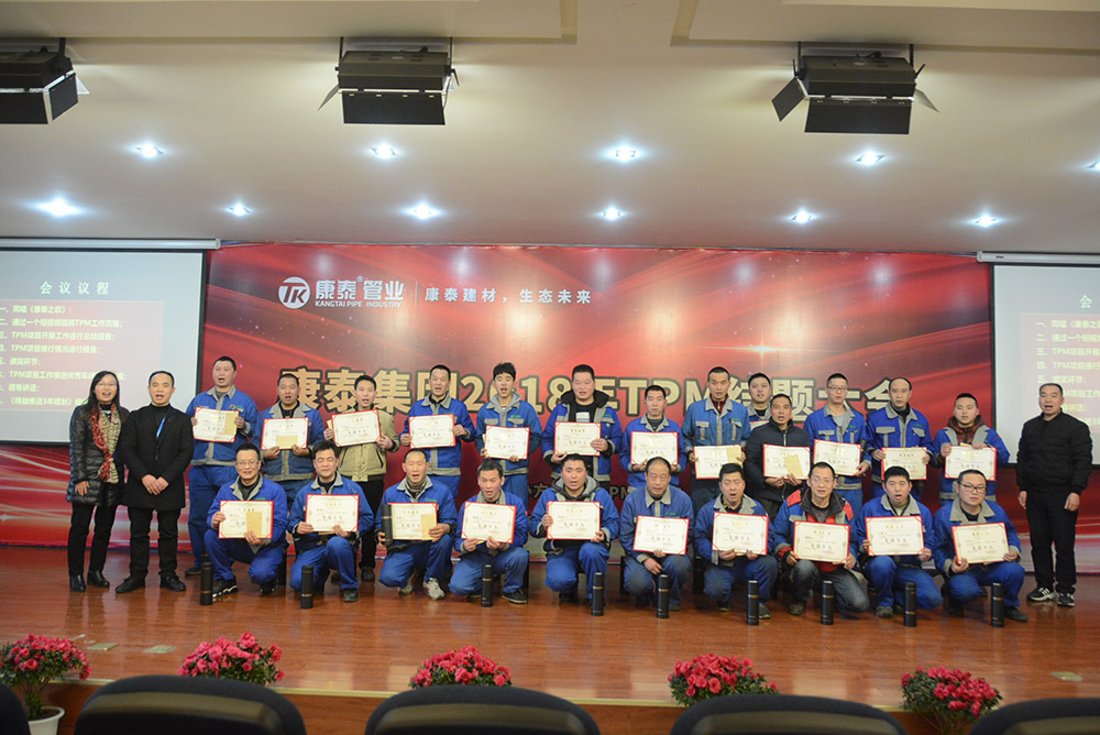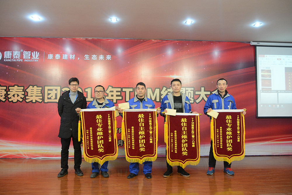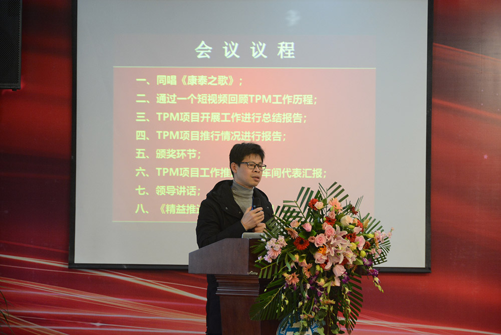 會(huì)議首先通過(guò)視頻回顧了TPM項(xiàng)目的導(dǎo)入、實(shí)施、改善,并對(duì)成果進(jìn)行了展示。隨后,TPM項(xiàng)目組組長(zhǎng)、生產(chǎn)副總監(jiān)李志堅(jiān)作了《TPM項(xiàng)目開(kāi)展工作進(jìn)行總結(jié)匯報(bào)》。為了提升康泰集團(tuán)在塑膠行業(yè)的競(jìng)爭(zhēng)力,滿足客戶日益多樣化的需求,2017年9月28日,康泰集團(tuán)導(dǎo)入了TPM——全面生產(chǎn)管理體系,圍繞TPM的自主維護(hù)、專業(yè)維護(hù)、現(xiàn)場(chǎng)改善及可視化等開(kāi)展活動(dòng)。通過(guò)活動(dòng)的開(kāi)展,生產(chǎn)系統(tǒng)各級(jí)對(duì)于TPM有了深刻的認(rèn)識(shí),車(chē)間員工學(xué)到了知識(shí),提升了技能,對(duì)設(shè)備的傳統(tǒng)觀念有了轉(zhuǎn)變。截止2019年1月,現(xiàn)場(chǎng)發(fā)現(xiàn)問(wèn)題7035項(xiàng),整改6590項(xiàng),整改率98% 。建立集團(tuán)設(shè)備預(yù)防性維修保養(yǎng)體系,形成階段性標(biāo)準(zhǔn)化文件8份,設(shè)備故障率下降30% 。