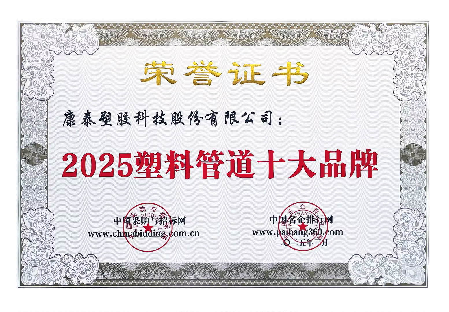 康泰集團(tuán)榮獲“2025塑料管道十大品牌”、“2025家裝管道十大品牌”等稱號(hào)2025/03/24 5702日前,在中國(guó)采購(gòu)與招標(biāo)網(wǎng)、中國(guó)名企排行網(wǎng)聯(lián)合主辦的中國(guó)塑料管道評(píng)價(jià)活動(dòng)...read more -