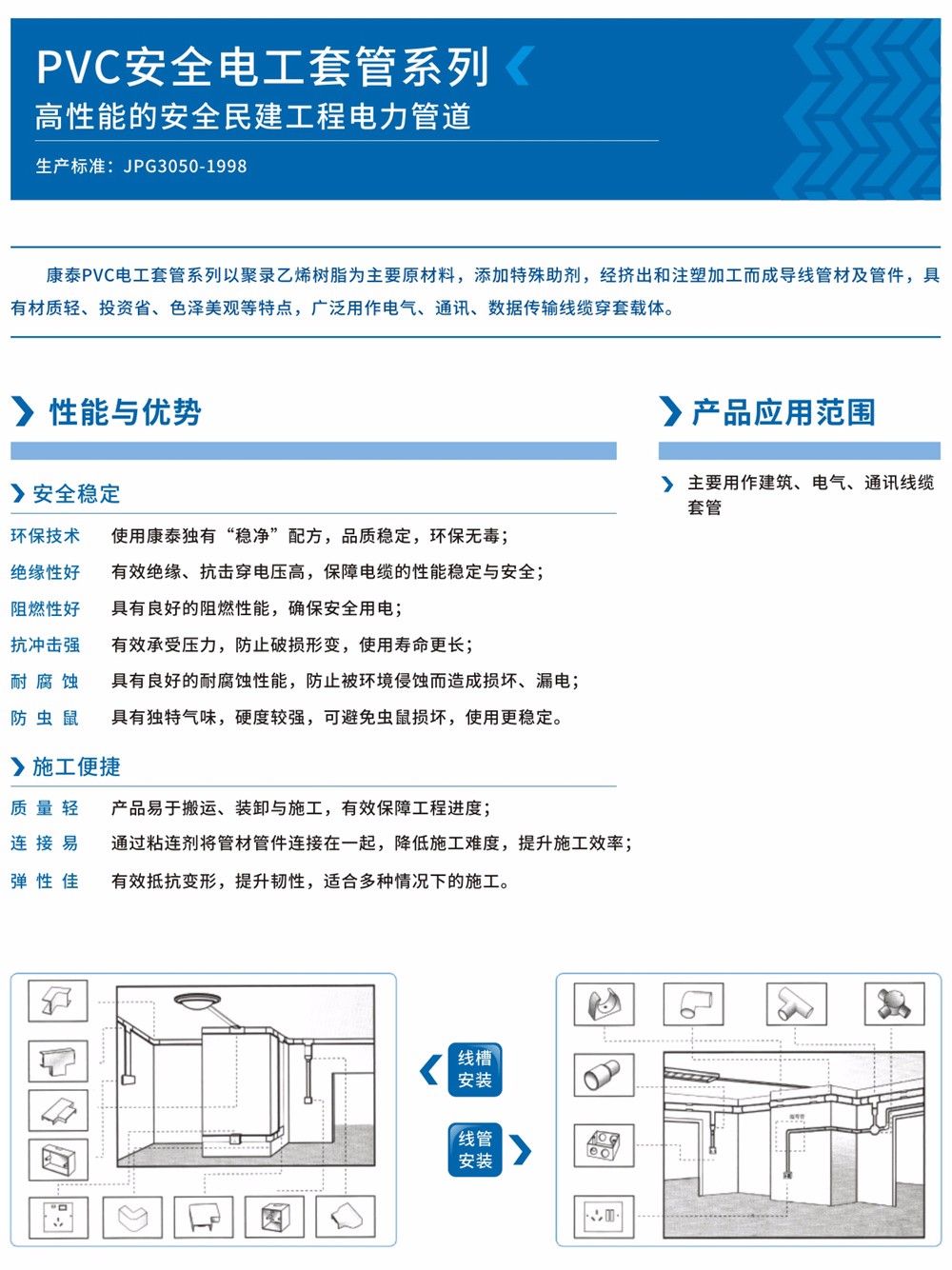 康泰牌PVC電工管是以聚氯乙烯樹脂為主要原材料,添加特殊助劑,經(jīng)擠出和注塑加工而成的導(dǎo)線管材或管件,具有材質(zhì)輕、投資省、色澤美觀等特點(diǎn),廣泛用作電氣、通訊、數(shù)據(jù)傳輸線纜穿套載體。