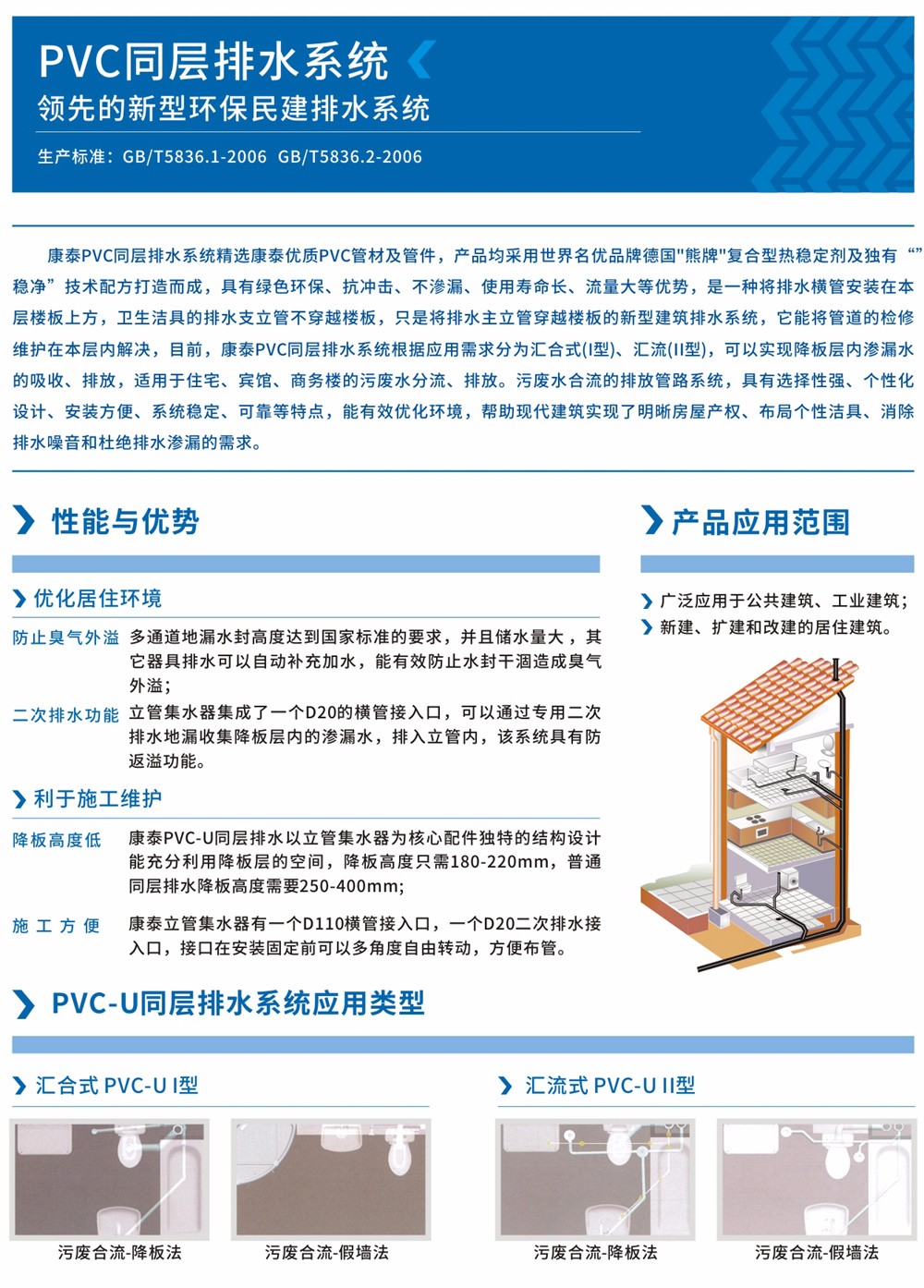 康泰PVC同層排水系統(tǒng)精選康泰優(yōu)質(zhì)PVC管材及管件,產(chǎn)品均采用世界名優(yōu)品牌德國“熊牌”復合型熱穩(wěn)定劑及獨有“穩(wěn)凈”技術配方打造而成 ,具有綠色環(huán)保、抗沖擊、不滲漏、使用壽命長、流量大等優(yōu)勢,是一種將排水橫管安裝在本層樓板上方,衛(wèi)生潔具的排水支立管不穿越樓板,只是將排水主立管穿越樓板的新型建筑排水系統(tǒng),它能將管道的檢修維護在本層內(nèi)解決。目前,康泰PVC同層排水系統(tǒng)根據(jù)應用需求分為匯合式(I型)、匯流式(Ⅱ型),可以實現(xiàn)降板層內(nèi)滲漏水的吸收、排放,適用于住宅、賓館、商務樓的污廢水分流、排放,污廢水合流的排放管路系統(tǒng),具有選擇性強、個性化設計、安裝方便、系統(tǒng)穩(wěn)定、可靠等特點,能有效優(yōu)化環(huán)境,幫助現(xiàn)代建筑實現(xiàn)了明晰房屋產(chǎn)權、布局個性潔具、消除排水噪音和杜絕排水滲漏的需求。