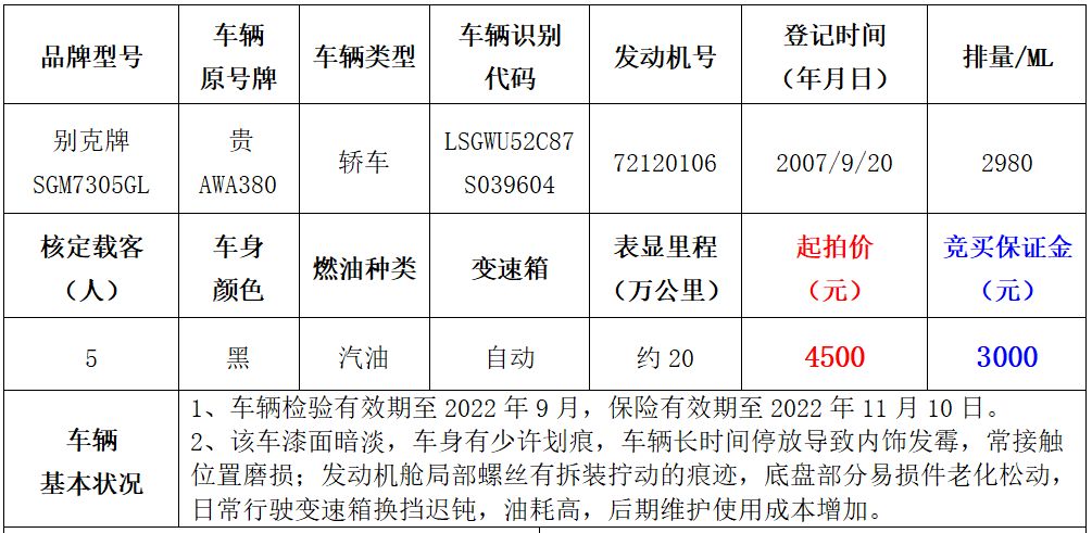 拍品編號1:別克牌SGM7305GL轎車一輛