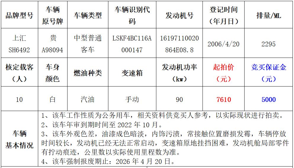 【已結(jié)束】上匯SH6492中型普通客車1輛