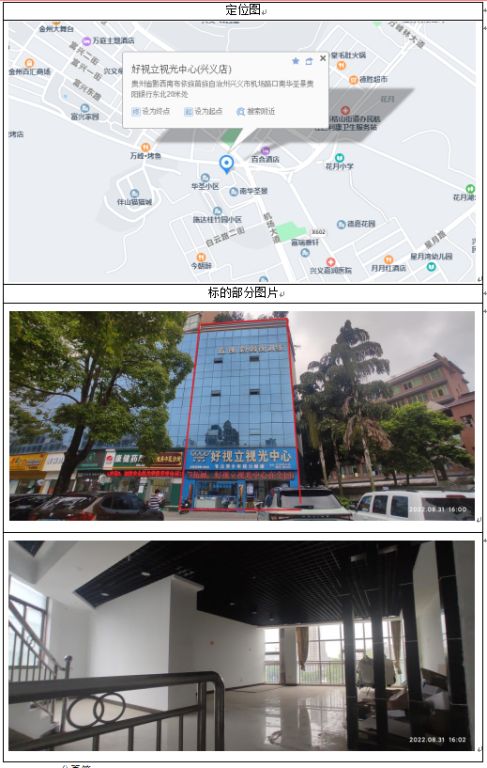 1、標(biāo)的位于興義市民航大道南華圣景4幢107號房屋,房屋總層數(shù)為16層,標(biāo)的所在層數(shù)為1-4層。產(chǎn)權(quán)證號:黔(2018)興義市不動產(chǎn)權(quán)第0016025號,房屋證載建筑面積438.56㎡(專有建筑面積:402.24㎡,分?jǐn)偨ㄖ娣e:36.32㎡。每層房屋建筑面積均為109.64㎡),規(guī)劃用途為商業(yè)服務(wù),框架結(jié)構(gòu)。