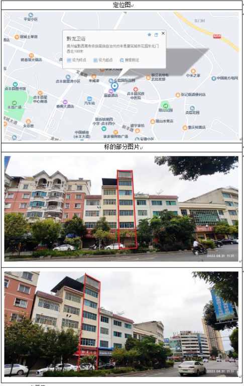 標(biāo)的位于貞豐縣龍場鎮(zhèn)興龍商貿(mào)區(qū),房屋總層數(shù)為6層。產(chǎn)權(quán)證號:貞房權(quán)證龍場鎮(zhèn)字第20120349號、貞國用2012第004022號,房屋證載建筑面積2278.03㎡(實測面積2263.59㎡),其中商用建筑面積:1818.71㎡,住宅建筑面積:459.32㎡;規(guī)劃用途為商住,混合結(jié)構(gòu)。證載土地面積1152㎡(實測面積1183.74㎡),地類用途為商住,使用權(quán)類型為出讓,土地使用權(quán)終止日期為2058年9月6日。