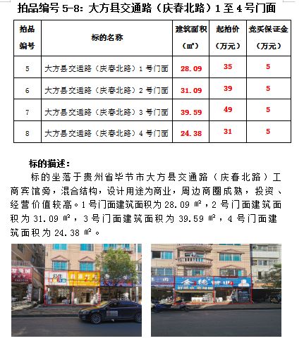 5、大方縣交通路(慶北春路)4間門面(建筑面積分別為:28.09、31.09、39.59、24.38