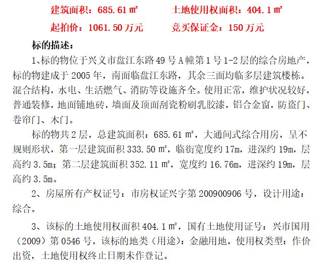 二、興義威舍支行營業(yè)用房及土地,建筑面積1370.22㎡,土地使用權面積1600.45㎡;