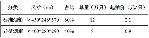 標(biāo)的物為非循環(huán)利用紙箱,年產(chǎn)數(shù)量為20余萬(wàn)只,由標(biāo)準(zhǔn)煙箱(占比約60%)和異型煙箱(占比約40%)組成,使用正常。參加拍賣會(huì)的意向競(jìng)買人須具備紙制品再生能源、廢舊物資回收等相關(guān)資質(zhì)。