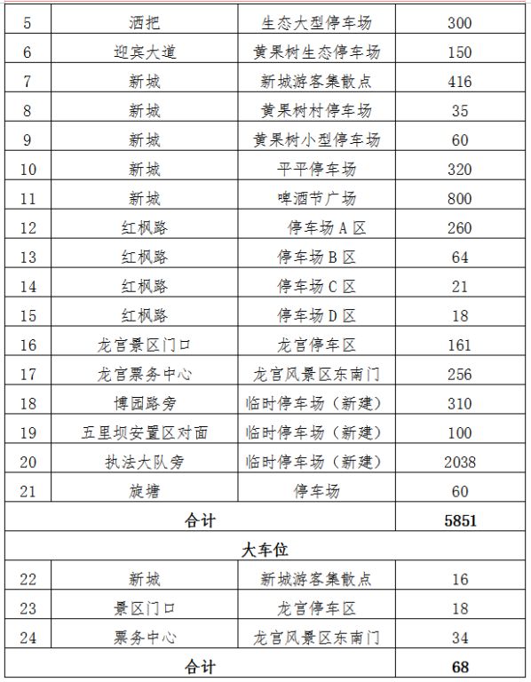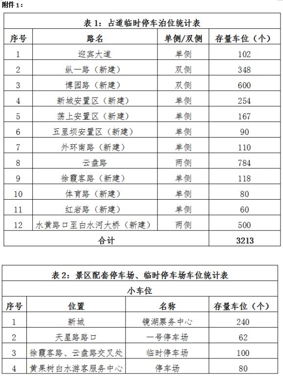 2.該標(biāo)的共計車位車9132個,出讓年限18年(含1年建設(shè)期),其中占道臨時停車泊位3213個,景區(qū)配套停車場、臨時停車場車位5919個,停車位分布詳見附件1(表1、表2),停車位具體收費標(biāo)準(zhǔn)詳見:黃管委發(fā)〔2019〕7號黃果樹旅游管理委員會關(guān)于印發(fā)《黃果樹旅游區(qū)停車場收費管理辦法》的通知。