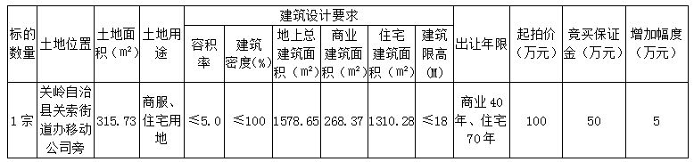(一)本次出讓地塊:關(guān)嶺自治縣關(guān)索街道一宗國有出讓建設(shè)用地使用權(quán),詳見宗地圖,土地用途為商服、住宅用地,出讓年限為商業(yè)40年、住宅70年。