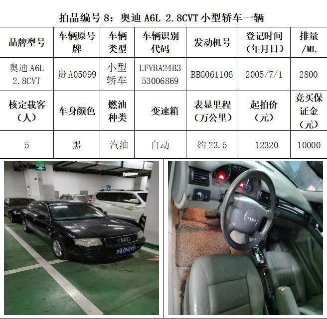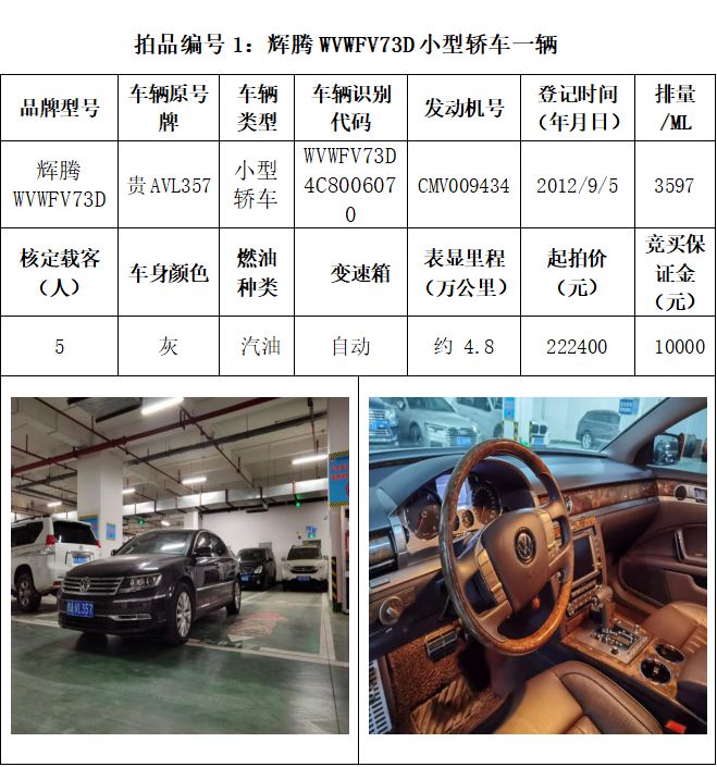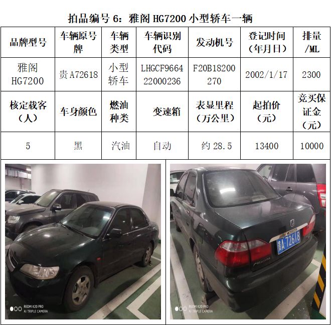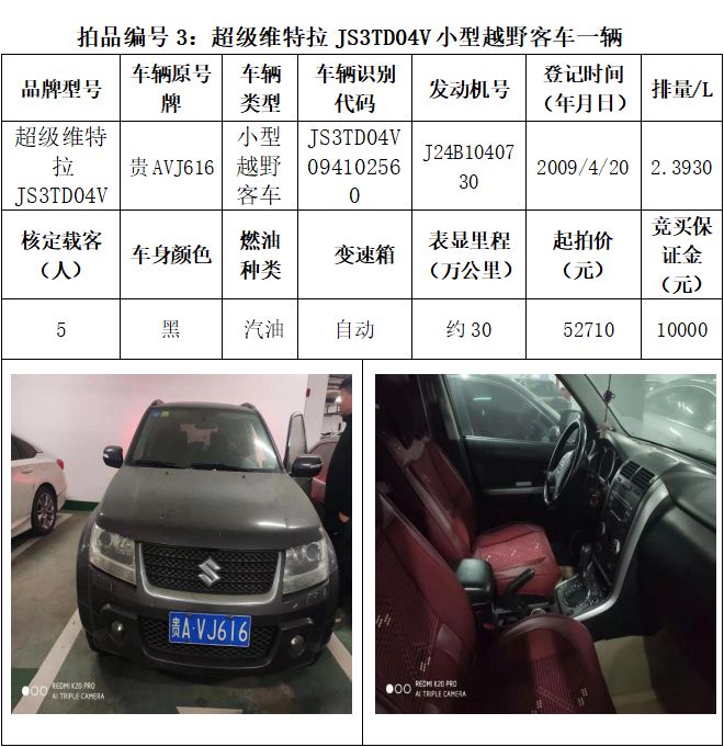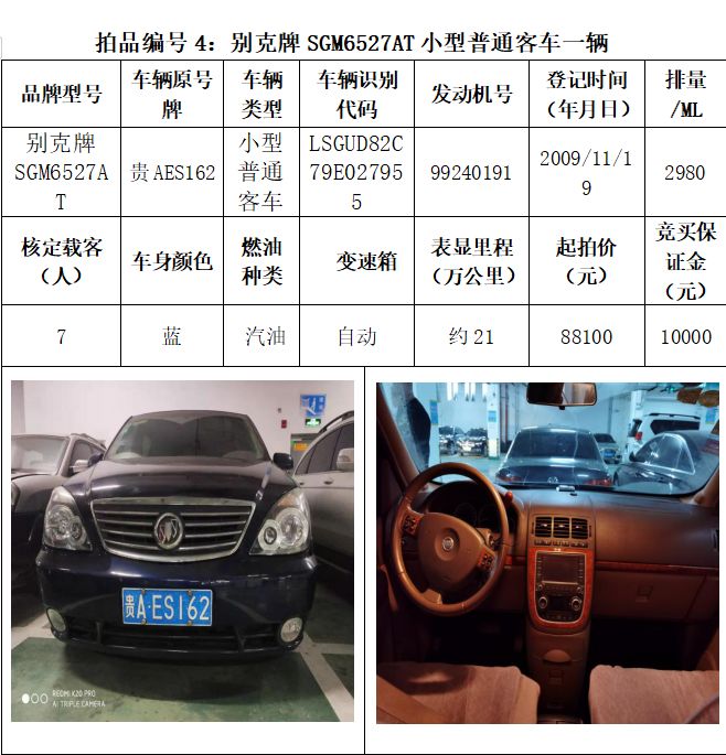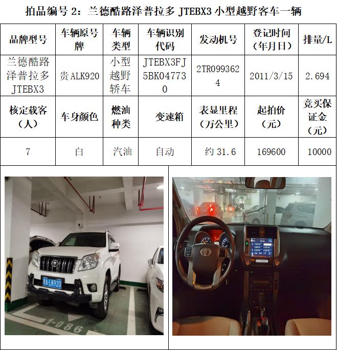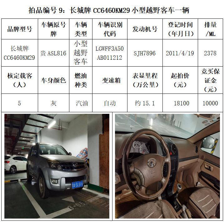 受委托,本公司定于2021年3月26日(星期五)下午14:30時,在貴陽市中華南路20號新大陸數(shù)碼廣場10樓D座拍賣廳公開拍賣以下車輛:普拉多越野車1輛、超級維特拉越野車1輛、別克商務(wù)旅行車1輛、輝騰轎車1輛、途勝越野車1輛、雅閣轎車2輛、奧迪轎車1輛,長城牌小型越野客車1輛,共計9輛車。