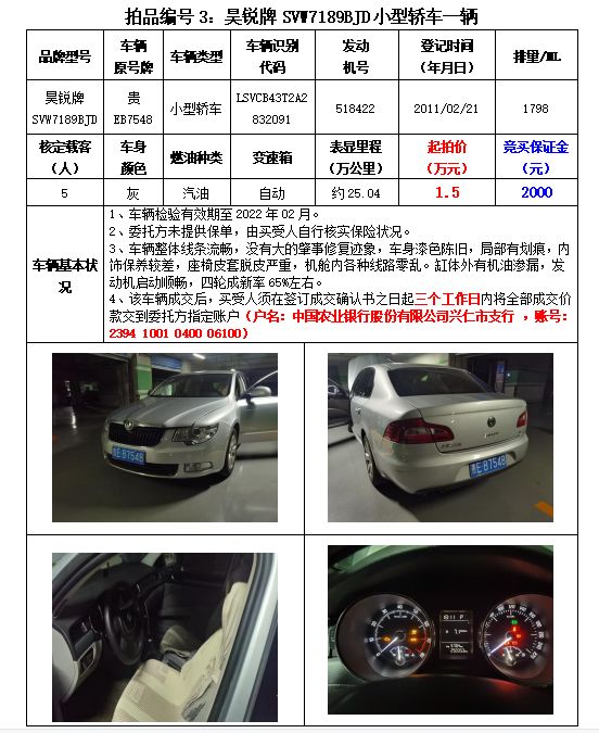 受委托,我公司定于2021年11月30日(星期二)下午14:30在貴州省黔西南州興義市瑞金南路45號(hào)(中國農(nóng)業(yè)銀行黔西南分行科技樓四樓會(huì)議室)公開拍賣以下標(biāo)的: