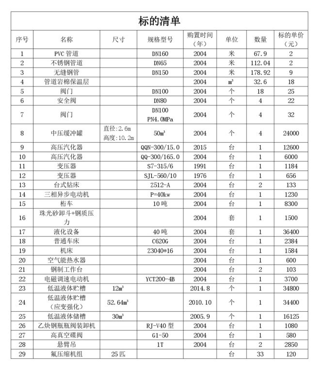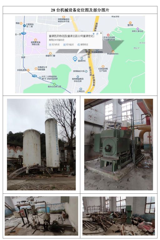 1、28臺機(jī)械設(shè)備屬于貴陽美佳220千伏變電站輸變電工程項(xiàng)目,現(xiàn)位于貴陽市南明區(qū)油榨街10號,包含管道、鋼管、管道巖棉保溫層、閥門、安全閥、中壓緩沖罐、高壓汽化器、變壓器、臺式鉆床、三相異步電動機(jī)、桁車、珠光沙卸斗+鋼質(zhì)壓力、液化設(shè)備、普通車床、機(jī)床、空氣能熱水器、鋼制工作臺、電磁調(diào)速電動機(jī)、低溫液體儲槽、乙炔鋼瓶瓶閥裝卸機(jī)、高真碟閥、懸臂吊等,從1976年到2015年間陸續(xù)購入,目前閑置,無維護(hù)保養(yǎng)。