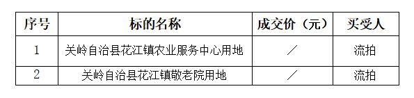 受委托,我公司于2022年4月22日(星期五)上午11:00在關(guān)嶺布依族苗族自治縣頂云天書酒店旁城投集團二樓會議室面向社會公開拍賣關(guān)嶺自治縣花江鎮(zhèn)農(nóng)業(yè)服務(wù)中心用地和關(guān)嶺自治縣花江鎮(zhèn)敬老院用地,其結(jié)果如下: