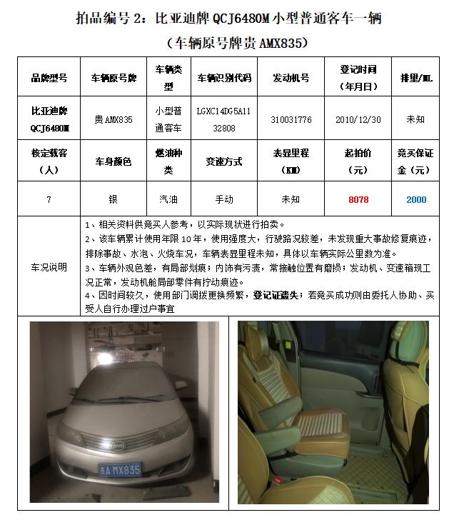 拍品編號(hào)2:原車牌號(hào)貴AMX835比亞迪牌QCJ6480M小型普通客車一輛;