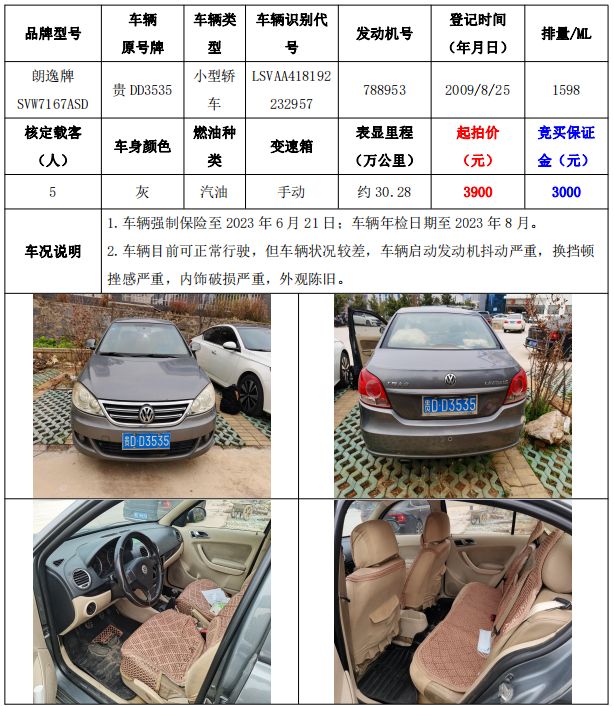 拍品編號10:朗逸牌SVW7167ASD小型轎車一輛