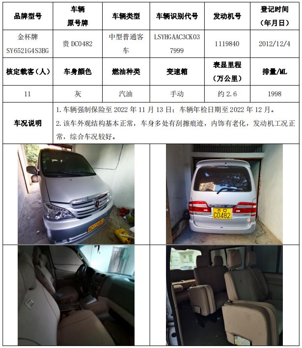 拍品編號19:三菱牌CFA2031H小型越野客車一輛、金龍牌KLQ6109E3大型普通客車一輛、江鈴全順牌JX6466DF-M小型普通客車一輛、東方日產(chǎn)牌DFL6460VFC1小型普通客車一輛