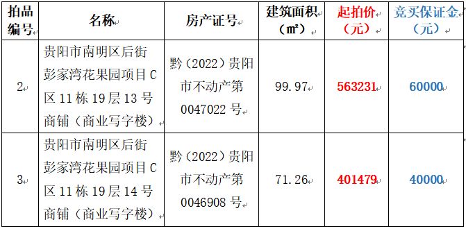 標(biāo)的位于貴陽市南明區(qū)花果園彭家灣花果園C區(qū)(貴陽國(guó)際中心1號(hào))11棟1單元19層13號(hào)、14號(hào)花果園商鋪(商業(yè)寫字樓),其中標(biāo)的2號(hào)建筑面積為99.97㎡、套內(nèi)面積為73.48㎡;標(biāo)的3號(hào)建筑面積為71.26㎡、套內(nèi)面積為52.38㎡。房屋為一般裝修,包含水電敷設(shè)及安裝、地面地磚、墻面刷瓷粉及乳膠漆、頂面鋁扣板吊頂、玻璃門。用途為辦公,鋼混結(jié)構(gòu),建成時(shí)間為2013年8月,所在層數(shù)19層,目前均為空置狀態(tài)。