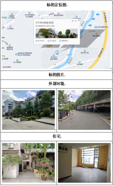 該標(biāo)的位于貴陽市水口寺中天世紀(jì)新城三組團(tuán)B1棟1單元3層2號(hào)及貴陽市南明區(qū)水口寺中天世紀(jì)新城三組團(tuán)G2棟負(fù)1層3號(hào)。