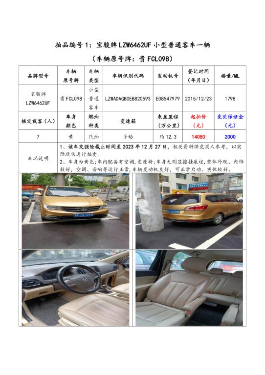 拍品編號1:寶駿牌LZW6462UF小型普通客車一輛(車輛原號牌:貴FCL098);