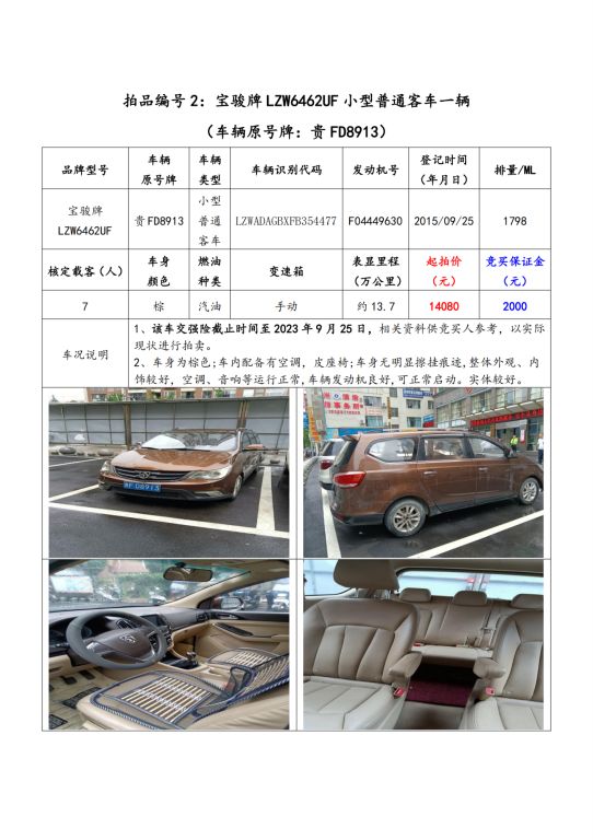 拍品編號2:寶駿牌LZW6462UF小型普通客車一輛(車輛原號牌:貴FD8913);