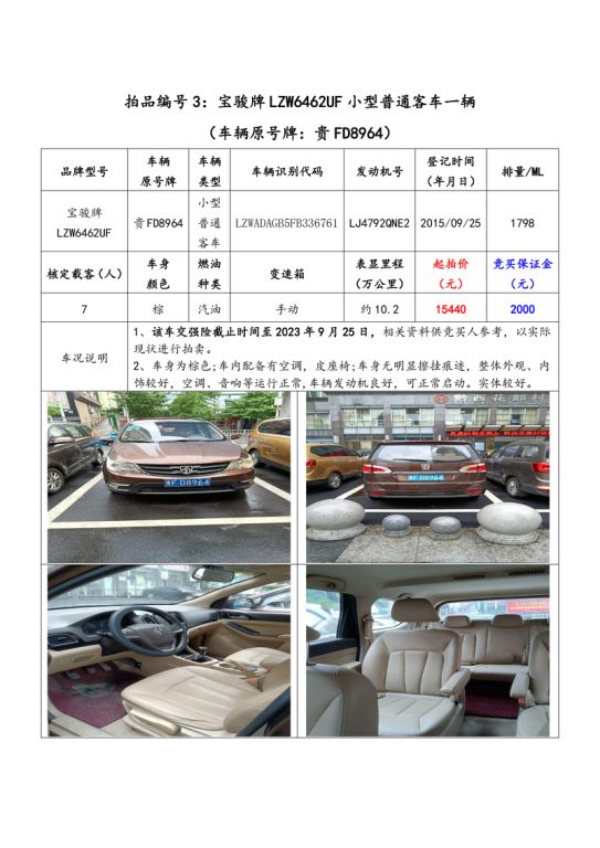 拍品編號3:寶駿牌LZW6462UF小型普通客車一輛(車輛原號牌:貴FD8964);