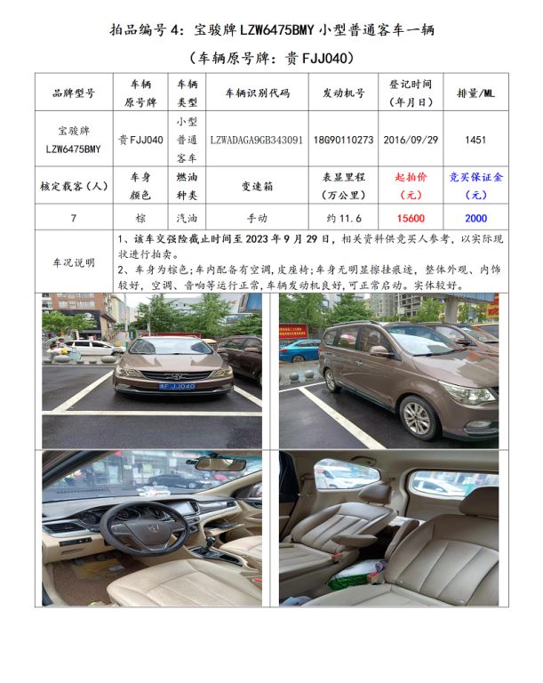 拍品編號4:寶駿牌LZW6475BMY小型普通客車一輛(車輛原號牌:貴FJJ040);