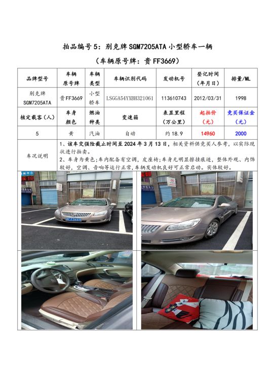 拍品編號5:別克牌SGM7205ATA小型轎車一輛(車輛原號牌:貴FF3669);