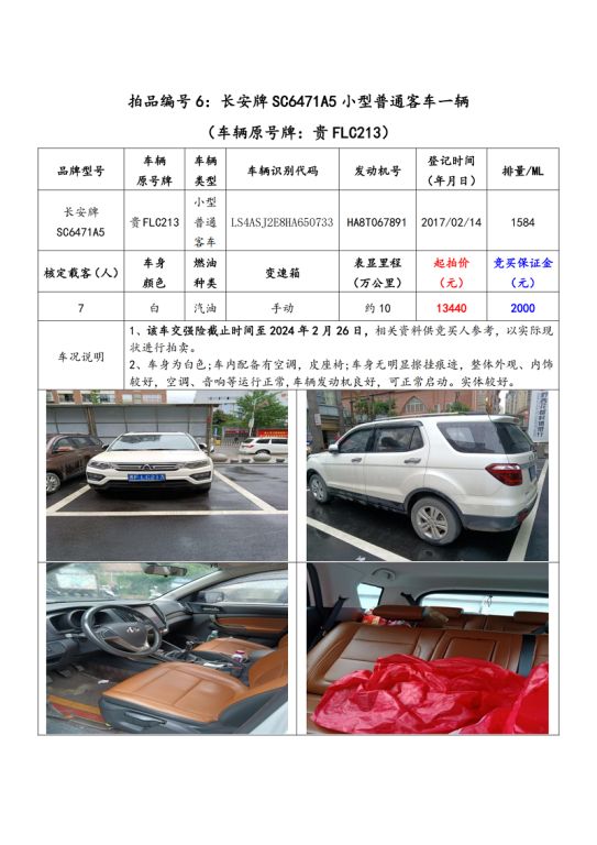 拍品編號6:長安牌SC6471A5小型普通客車一輛(車輛原號牌:貴FLC213);