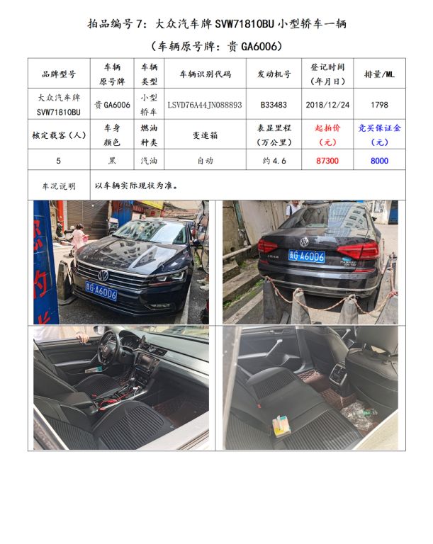 拍品編號7:大眾汽車牌SVW71810BU小型轎車一輛(車輛原號牌:貴GA6006)。