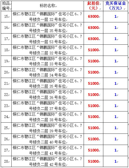 拍品編號(hào)15-33:銅仁市碧江區(qū)“錦鵬國際”住宅小區(qū)6、7號(hào)樓負(fù)一層:32號(hào)、35號(hào)、53號(hào),負(fù)二層:32號(hào)-47號(hào)共計(jì)19個(gè)車位