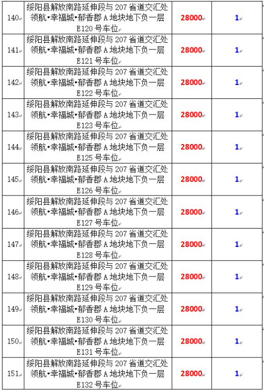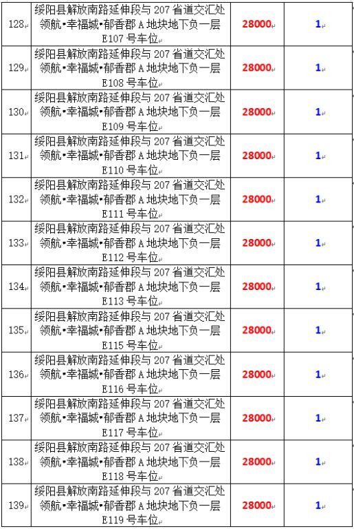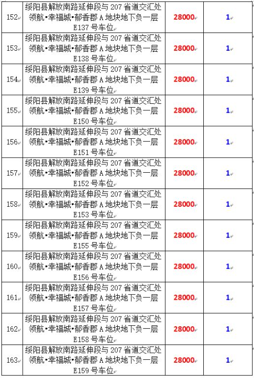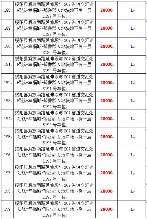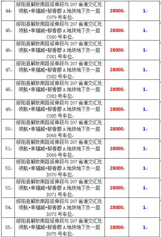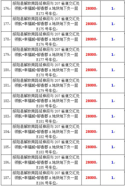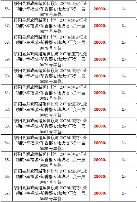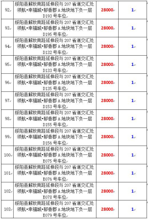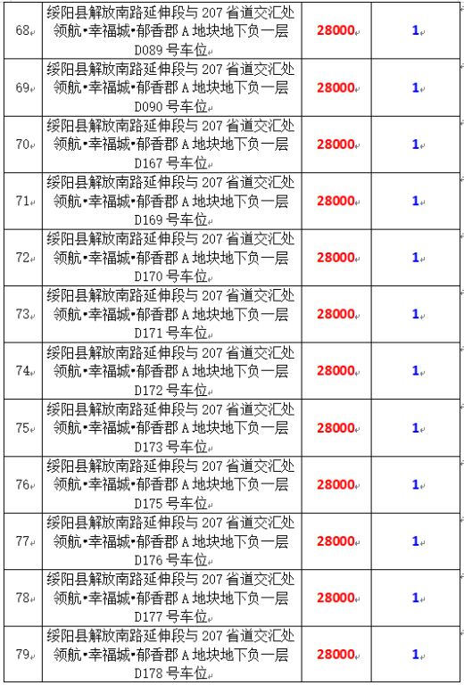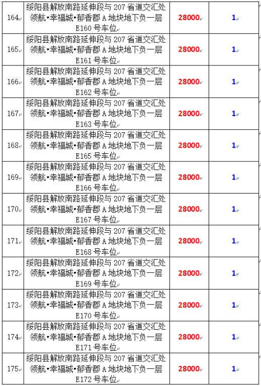 1、標(biāo)的坐落于綏陽縣解放南路延伸段與207省道交匯處領(lǐng)航?幸福城?郁香郡A地塊地下負(fù)一層。標(biāo)的總數(shù)為170個(gè)車位,水電設(shè)施齊全。