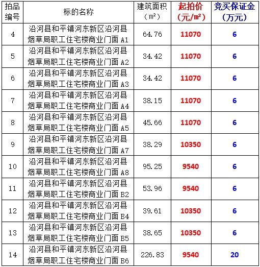 4、沿河縣和平鎮(zhèn)河?xùn)|新區(qū)沿河縣煙草局職工住宅樓商業(yè)門(mén)面11間,建筑面積:34.42㎡-226.83㎡,起拍價(jià):9540元/㎡-11070元/㎡,競(jìng)買(mǎi)保證金:6萬(wàn)元/間。