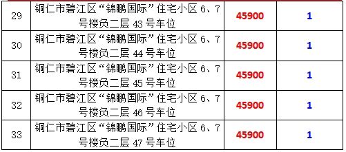 拍品編號(hào)15-33:銅仁市碧江區(qū)“錦鵬國(guó)際”住宅小區(qū)6、7號(hào)樓負(fù)一層:32號(hào)、35號(hào)、53號(hào),負(fù)二層:32號(hào)-47號(hào)共計(jì)19個(gè)車(chē)位