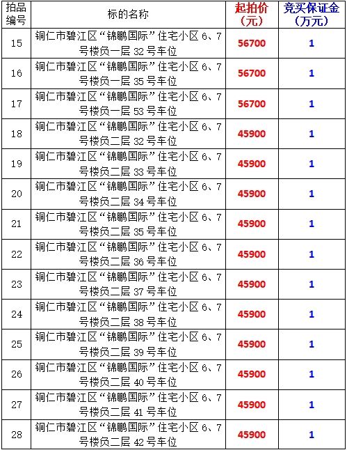 5、銅仁市碧江區(qū)“錦鵬國(guó)際”住宅小區(qū)6、7號(hào)樓負(fù)一層;32號(hào)、35號(hào)、53號(hào),負(fù)二層;32號(hào)-47號(hào)共計(jì)19個(gè)車(chē)位,起拍價(jià):45900元-56700元,競(jìng)買(mǎi)保證金:1萬(wàn)元/個(gè)。