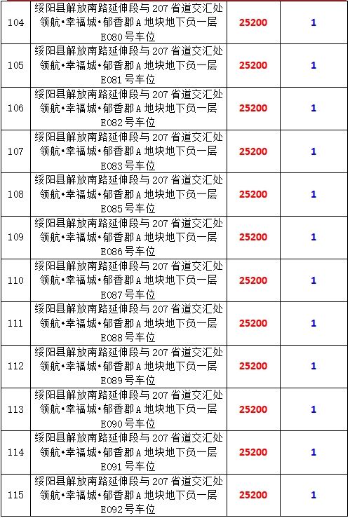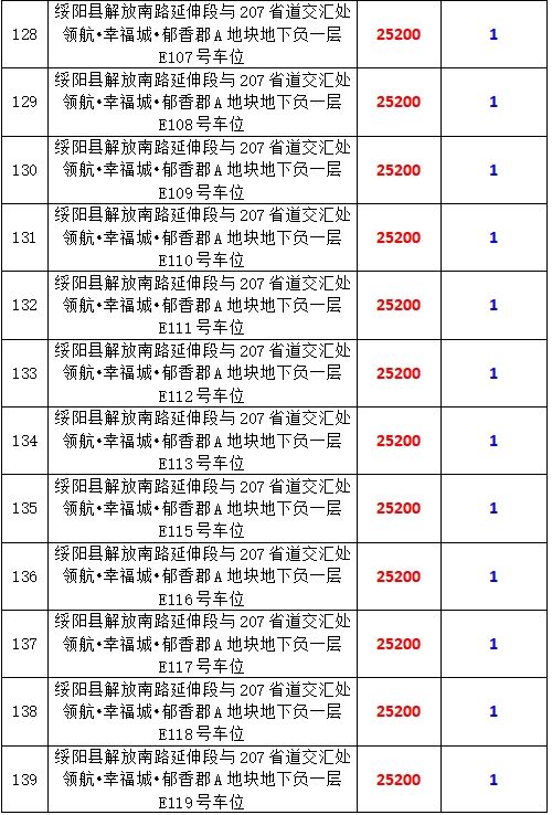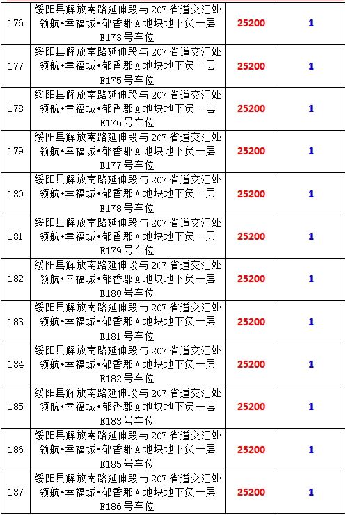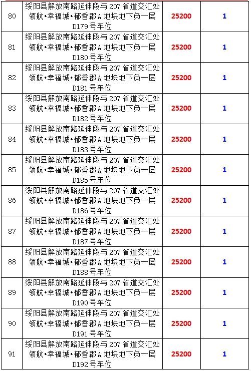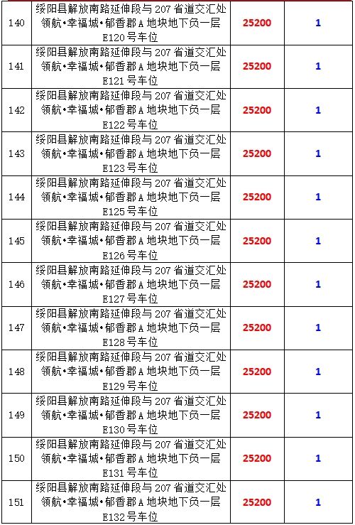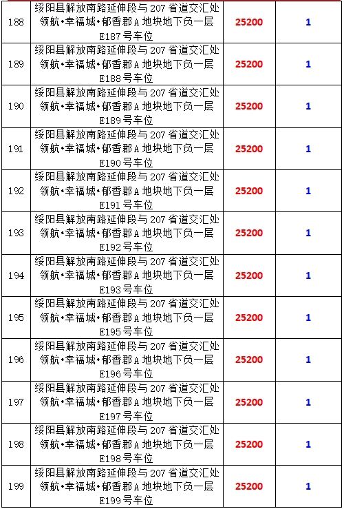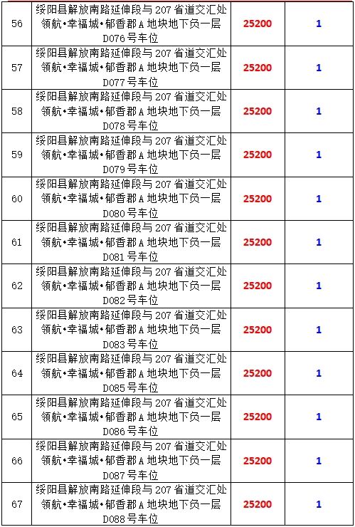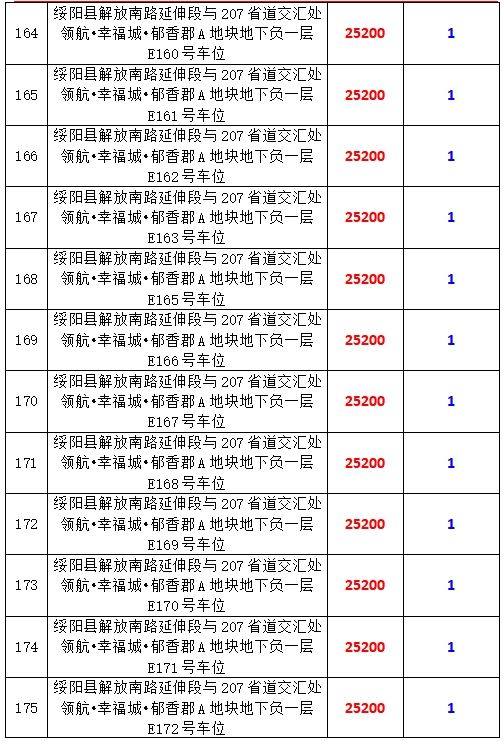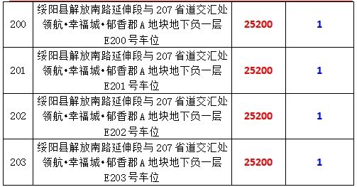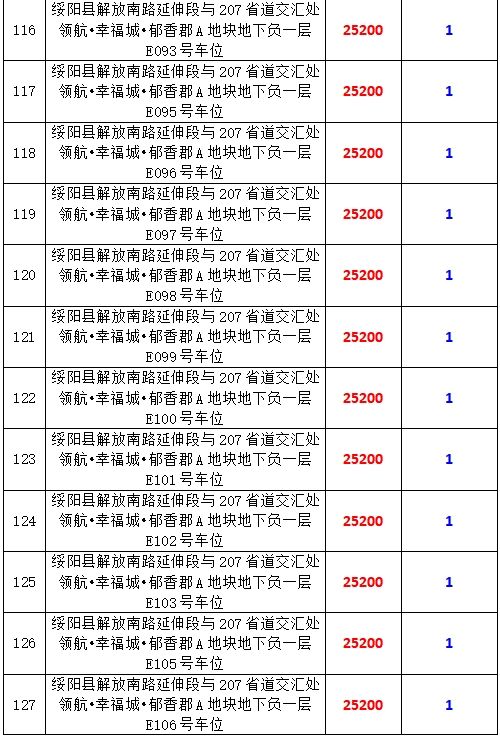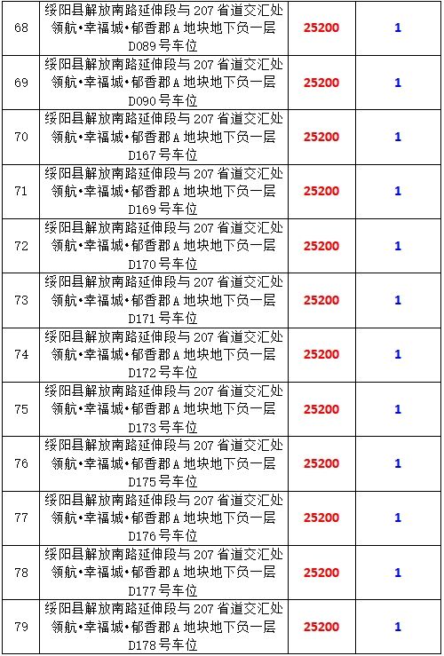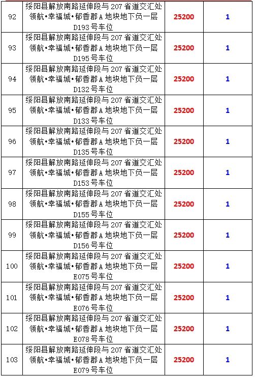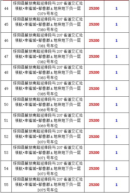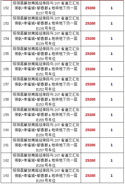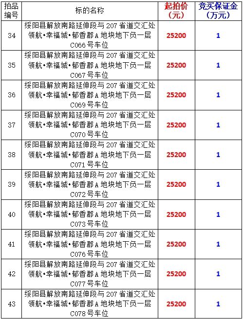 6、綏陽(yáng)縣解放南路延伸段與207省道交匯處領(lǐng)航?幸福城?郁香郡A地塊地下負(fù)一層170個(gè)車(chē)位,起拍價(jià):25200元/個(gè),競(jìng)買(mǎi)保證金:1萬(wàn)元/個(gè)。