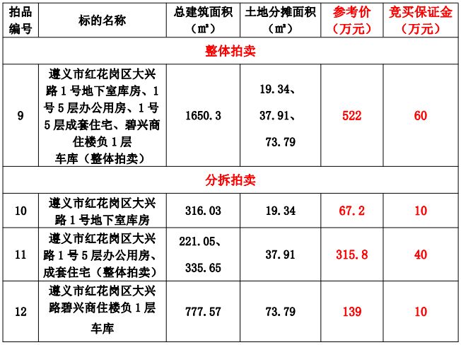 標(biāo)的:遵義市紅花崗區(qū)大興路1號地下室?guī)旆俊?號5層辦公用房、1號5層成套住宅、碧興商住樓負(fù)1層車庫