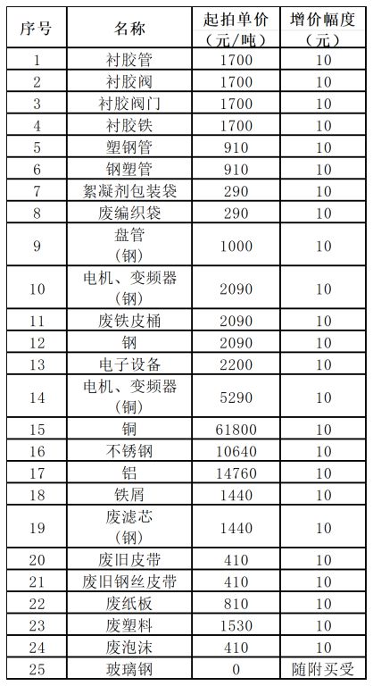 襯膠管每增加10元/噸,第2-24項(xiàng)廢舊材料同步增加10元/噸;買受人買受1-24項(xiàng)廢舊材料的同時(shí),以起拍價(jià)隨附買受第25項(xiàng)廢舊材料。