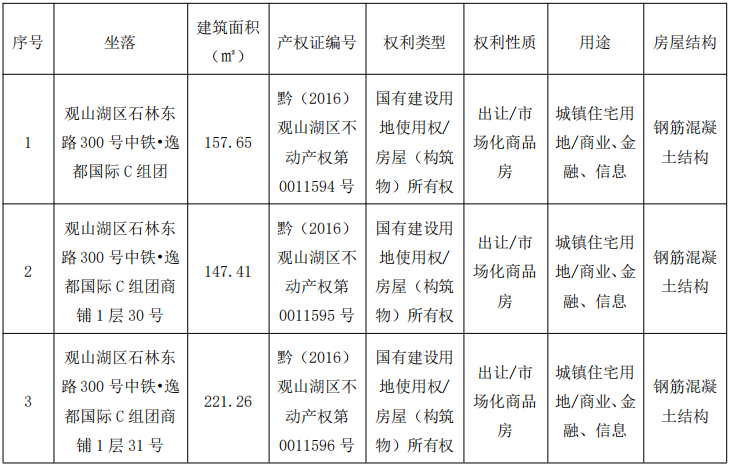 貴陽市觀山湖區(qū)石林東路300號(hào)中鐵·逸都國際C組團(tuán)商鋪、1層30號(hào)商鋪、1層31號(hào)商鋪,共計(jì)3間,建筑面積分別為:157.65㎡、147.41㎡、221.26㎡