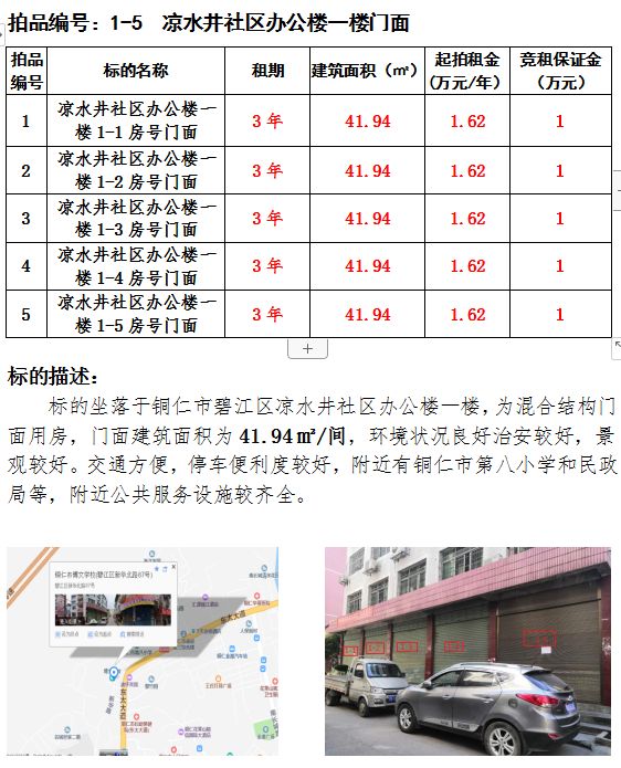 1、涼水井社區(qū)辦公樓一樓門面5間1-1、1-2、 1-3、 1-4、 1-5)3年租賃權(建筑面積:41.94㎡/間);起拍租金單價(每間):1.62萬元/年;競租保證金(每間):1萬元;
