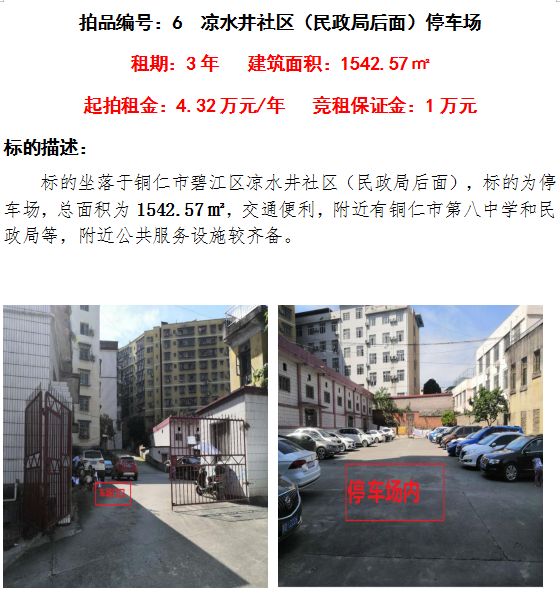 2、涼水井社區(qū)(民政局后面)停車場3年租賃權(建筑面積:1542.57㎡);起拍租金:4.32萬元/年;競租保證金:1萬元;