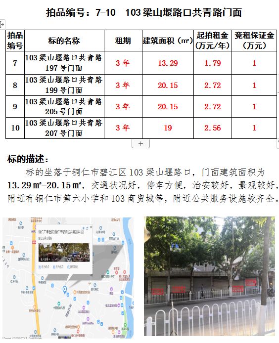 3、103梁山堰路口門面四間3年租賃權(建筑面積:13.29㎡-20.15㎡);起拍租金單價:1.79萬元/年-2.72萬元/年;競租保證金:1萬元;