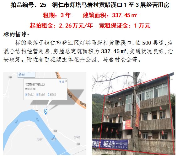 6、銅仁市碧江區(qū)燈塔馬巖村黃臘溪口1-3層經營房3年租賃權(建筑面積:337.45㎡);起拍租金單價:2.26萬元/年;競租保證金:1萬元;